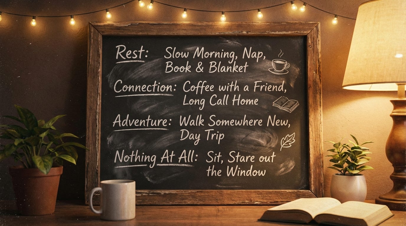 When you’re just depleted, the truest reward might be sleeping without setting an alarm, canceling something you were dreading (the relief itself is the reward), or doing something deliberately slow: a walk, a bath, a cup of tea, or nothing at all.